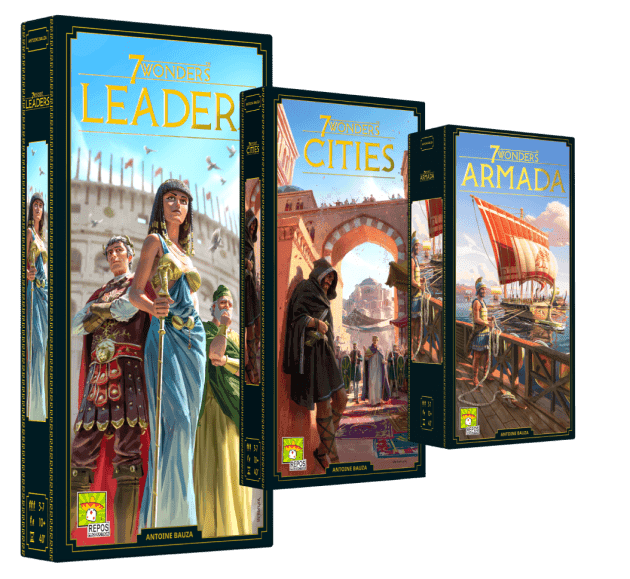 Continue to explore the 7 Wonders universe and dive into three expansions and one 2v2 version of the game.